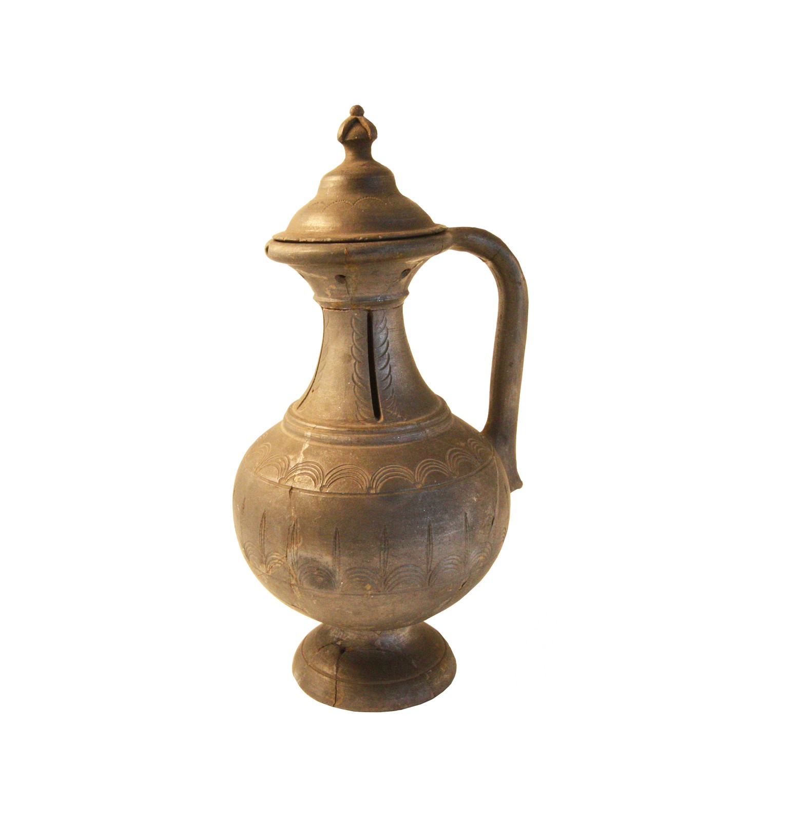 A bilha possui uma tampa circular tendencialmente cónica, polida com decoração pontilhada, formando grinaldas, no topo apresenta uma pega esférica com decoração em relevo.
