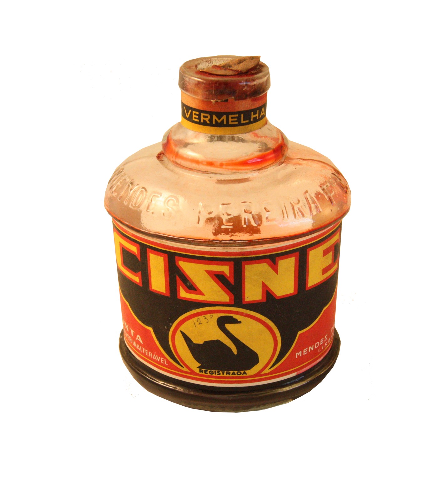 Na parte traseira apresenta um rótulo mais pequeno com a inscrição: “Tinta Cisne/ M.P. F.º Lda./n.º 26 -1/2 L.” O frasco ainda apresenta no interior tinta vermelha.