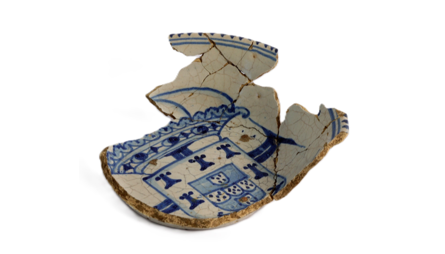 Taça em faiança decorada com a coroa real e o escudo nacional sobre a cruz da Ordem de Cristo, motivos pintados a azul sobre fundo branco, atribuível ao século XVII. O vidrado apresenta muitas imperfeições e marcas das trempes usadas pelos oleiros para separar as peças durante a cozedura.